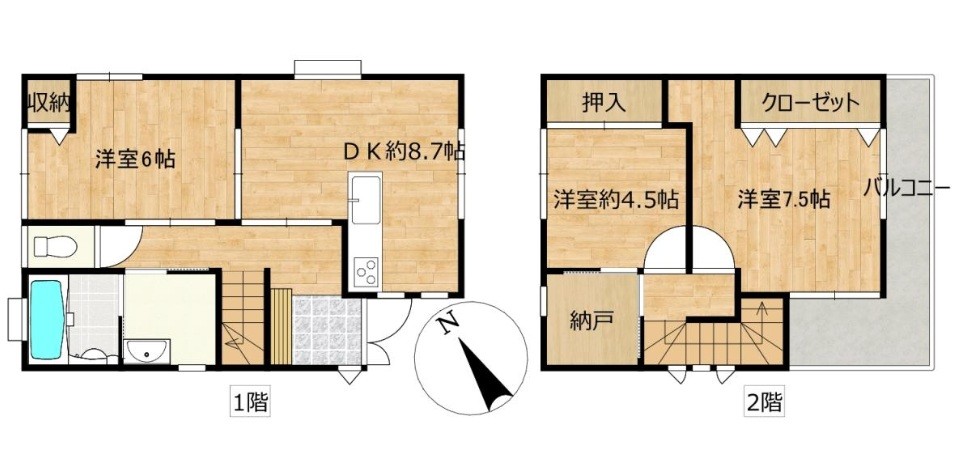 | 土地面積 | 98.77㎡(約29坪) | 間取り | 1F DK8.7 洋6 2F 洋4.5・7.5 |