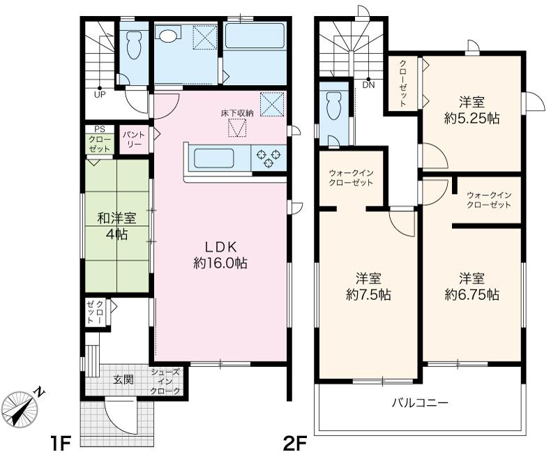 土地面積 | 132.23㎡(約39坪) | 間取り | 1F LDK16 和4 2F 洋5.25・6.75・7.5 |