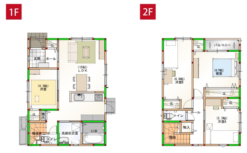 - ・1階15LDK、4.3洋・2階6.8洋、6.7洋、5.3洋