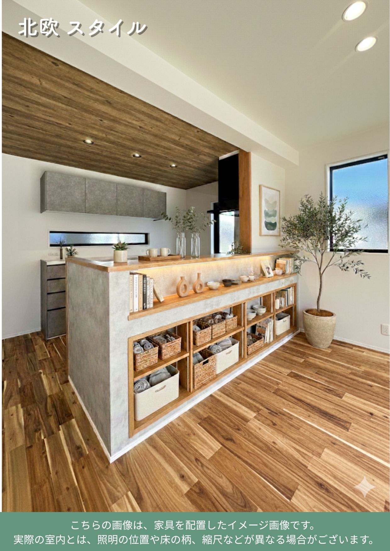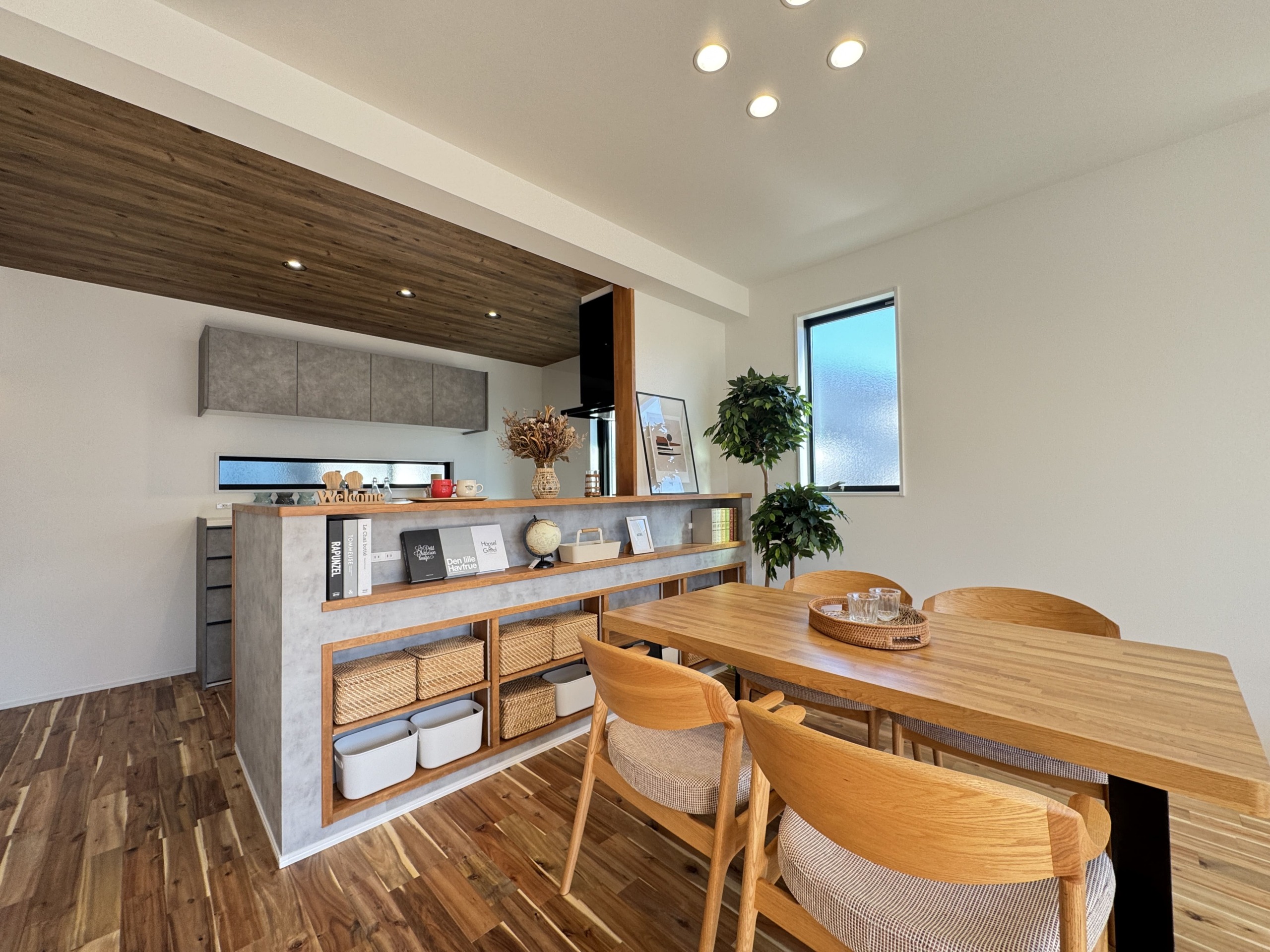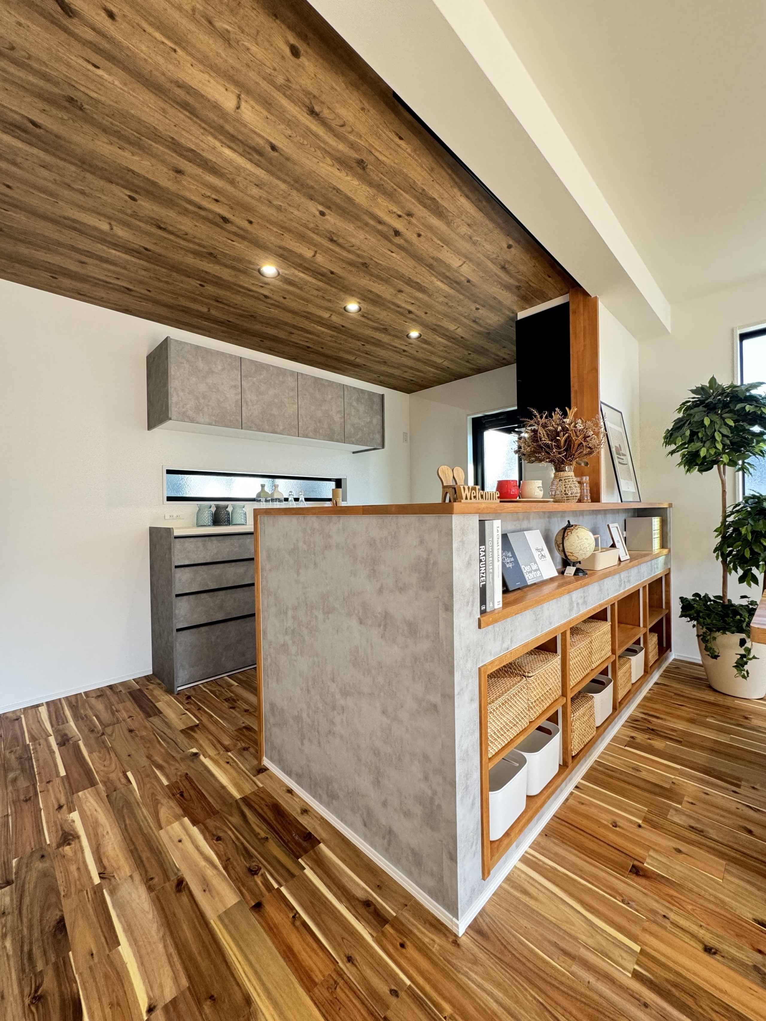 床と天井には木目を組み合わせた、