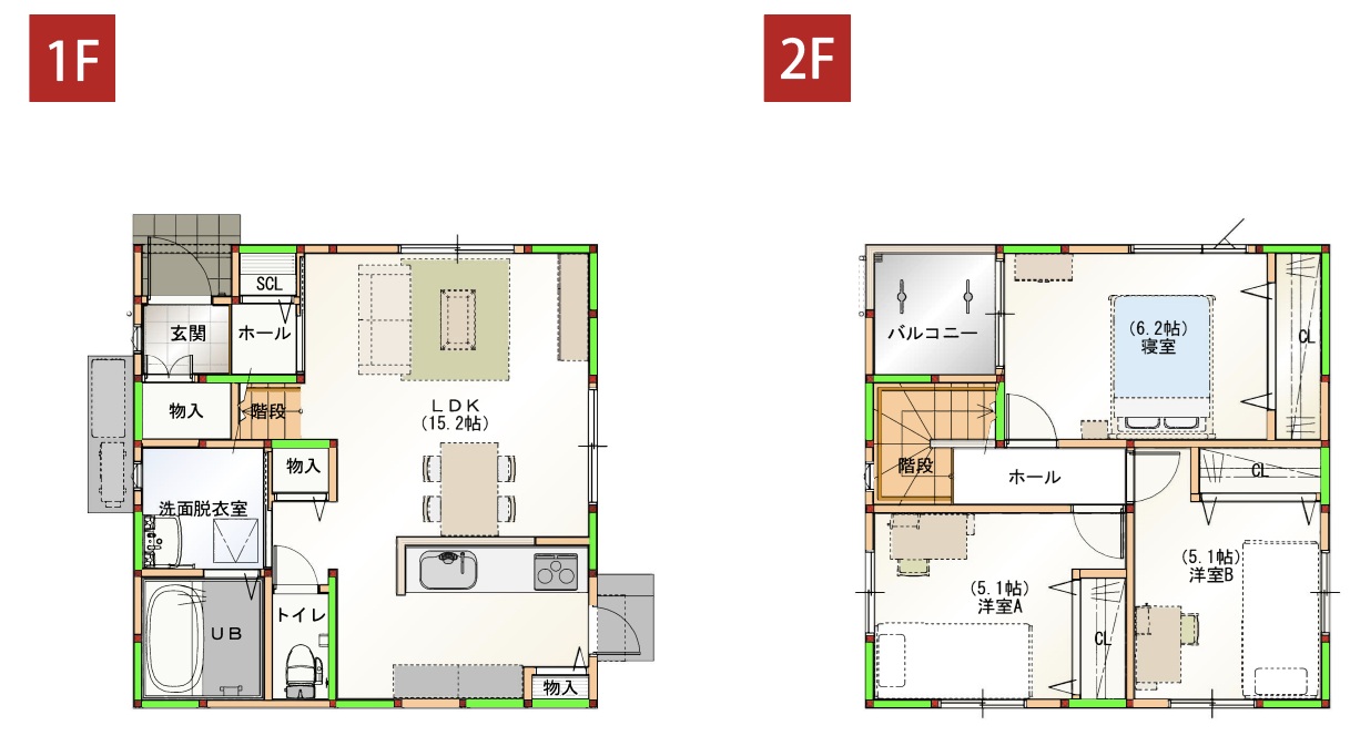 - ・1階15.2LDK・2階6.2洋、5.1洋、5.1洋