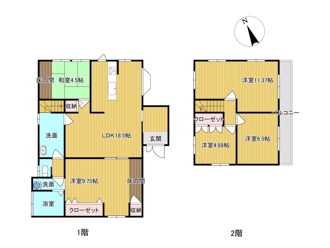 | 土地面積 | 196.49㎡(約59坪) | 間取り | 1F LDK18.5 和4.5 洋9.75 2F 洋6.5・4.88・11.37 |