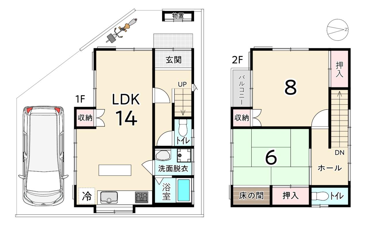 土地面積 72.16㎡(約21坪) 間取り 1F LDK14 2F 和6 洋8